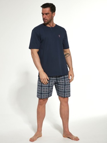 Komfortowa piżama męska z krótkim rękawem i spodenkami, wykonana z naturalnej bawełny. Miękki w dotyku materiał pozwala skórze oddychać. Pełną swobodę ruchu zapewnia jeansowa bluzka z okrągłym dekoltem zapinanym na 2 guziczki. Komfortowe spodenki w kratę z szeroką gumą w pasie stanowią świetne uzupełnienie kompletu piżamowego. Piżama sprawdzi się również jako praktyczny prezent, jest zapakowana w estetyczny kartonik.