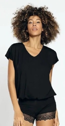 Elegancki, a zarazem stylowy komplet wykonany jest z przyjemnej w dotyku wiskozy. Komplet Tamara składa się z luźnej koszulki ze ściągaczem oraz krótkich spodenek. Tył koszulki oraz spodenki ozdobione są piękną, wzorzysta koronką.
