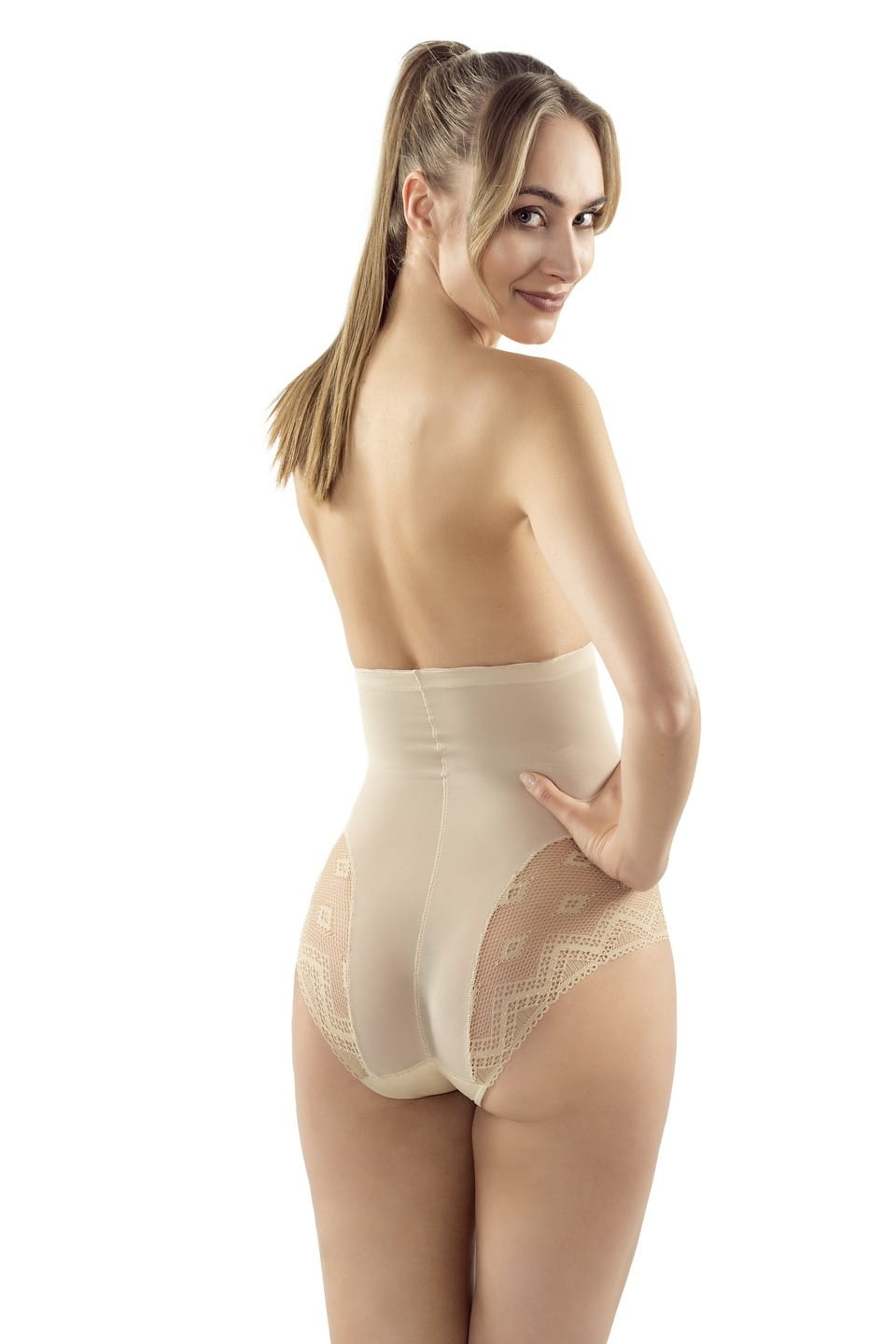 Eleganckie figi korygujące damskie z wysokim stanem. Figi idealnie modelują brzuch oraz talię. Zostały wykonane z opinającej siateczki z koronkowym wykończeniem. Przód zdobi wstawka z mikrofibry. W górnej linii od wewnątrz znajduje się silikonowy pasek zapobiegający zsuwaniu. Figi pakowane w estetyczne pudełko.