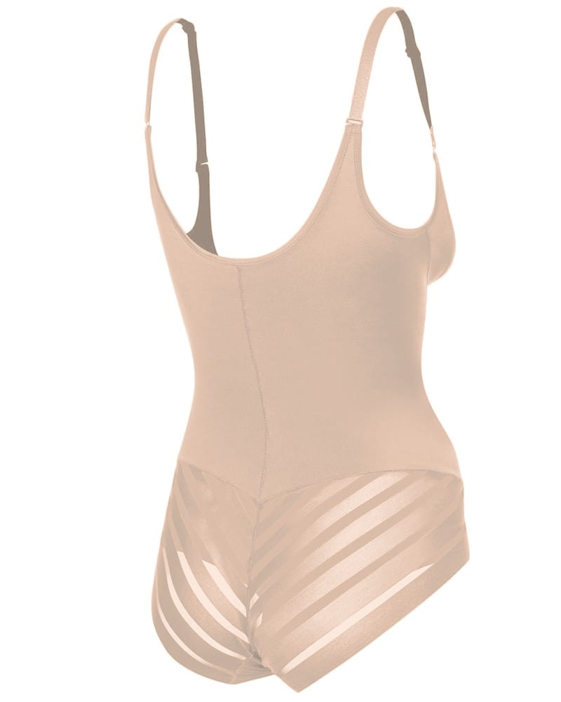 Body pod biust z siatką uszyte z najwyższej jakości materiału, który zapewnia odprowadzenie wilgoci i daje komfortowe samopoczucie. Niewidoczne pod ubraniem dzięki bezszwowej, nowoczesnej technologii wykończenia brzegów INVISIBLE-LINE®. Na pośladkach umieszczono seksowne transparentne wstawki. Tułów gładki, wykonany z połyskującego bardzo dobrze modelującego talię i brzuch materiału. Ramiączka posiadają innowacyjne zapięcie, oraz są odpinane i regulowane, w prezencie para silikonowych ramiączek. Tył na pośladkach wykończony na płasko tak, żeby nic nie odznaczało się pod ubraniem. Model posiada w kroku wkładkę bawełnianą i regulowane zapięcie na haftki.