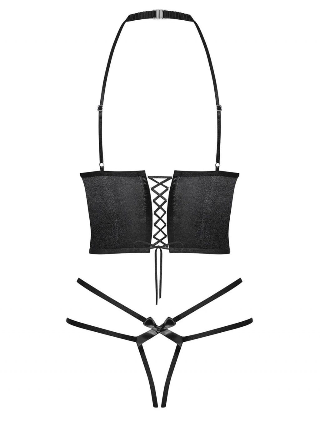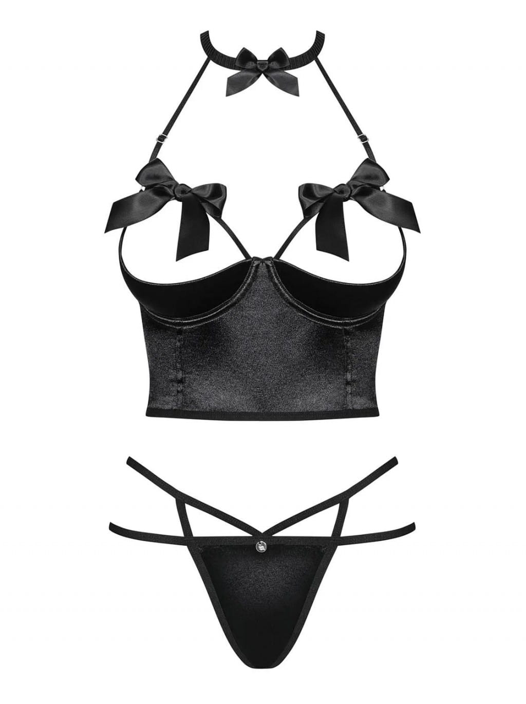Zmysłowy, dwuczęściowy komplet: półgorset i stringi. Piękny choker z satynową kokardką i zapięciem na szyi. Cztery regulowane paseczki – na dekolcie i plecach. Gorsetowe wiązanie na plecach – możliwość dopasowania. Otwarte, usztywniane miseczki na fiszbinach – podkreślone piersi. Kokardki nad miseczkami – niesamowicie gorące detale. Biżuteryjna zawieszka na stringach. Satynowa kokardka nad pośladkami i paski zdobiące biodra. Zestaw zawiera półgorset i stringi. Przyjemne materiały.
