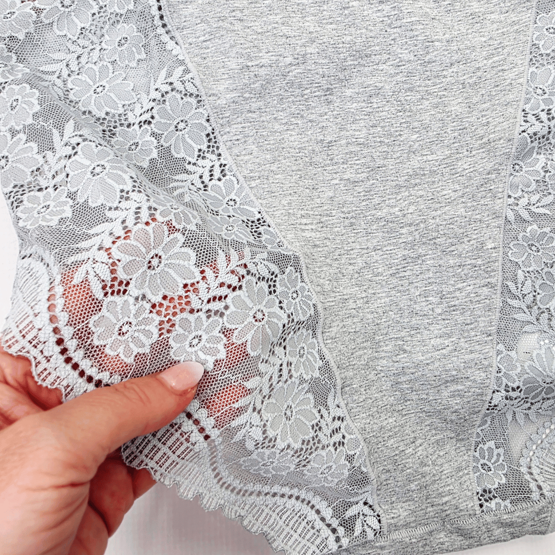 Przód łączy gładką dzianinę z dekoracyjną koronką, która nadaje całości eleganckiego wyglądu. Tył wykonany z miękkiej, przyjemnej w dotyku bawełny, został wykończony koronkowym pasem, co podkreśla kobiecą sylwetkę i dodaje lekkości. Wysoki stan zapewnia wygodę i pomaga delikatnie tuszować drobne niedoskonałości w okolicach talii i brzucha.