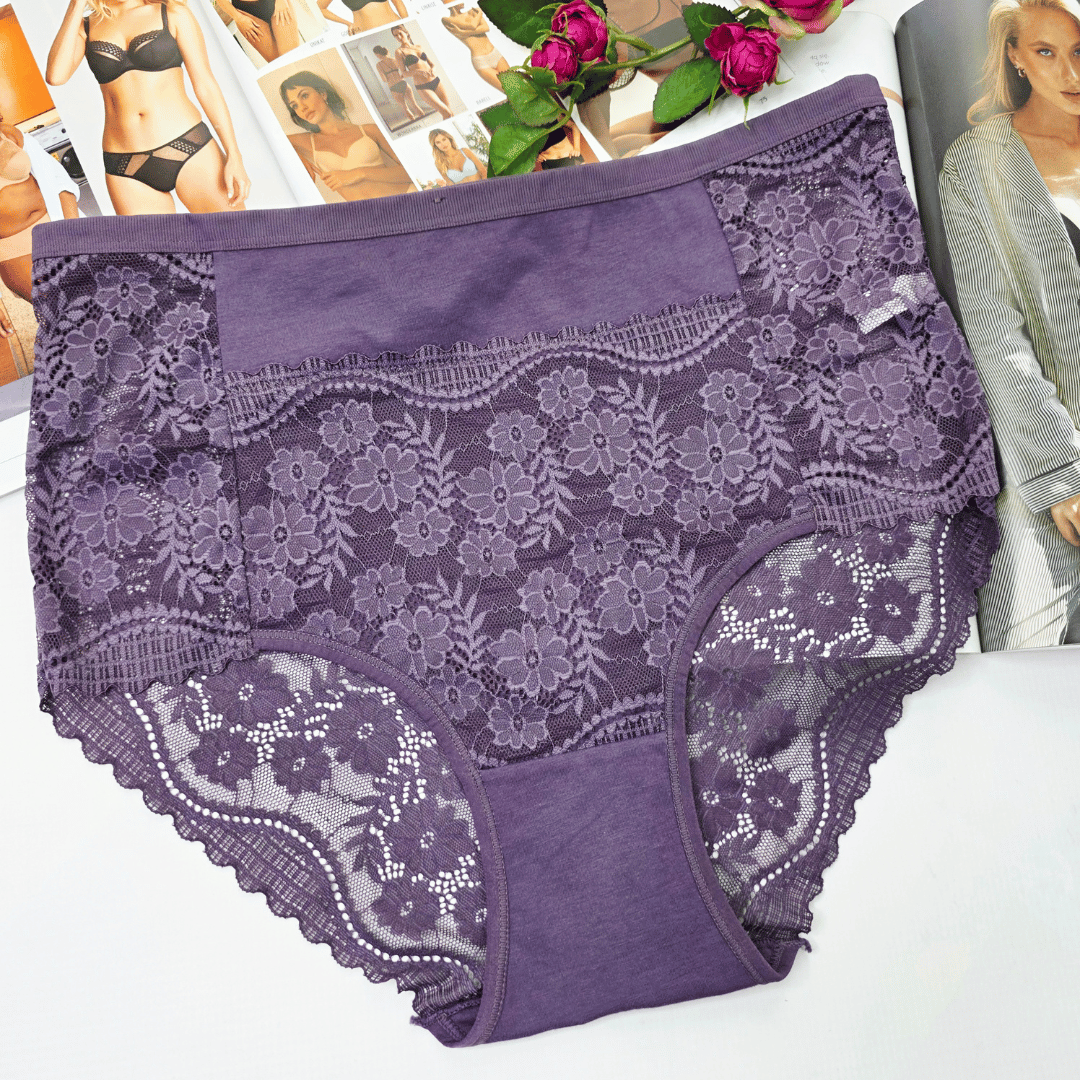 Przód łączy gładką dzianinę z dekoracyjną koronką, która nadaje całości eleganckiego wyglądu. Tył wykonany z miękkiej, przyjemnej w dotyku bawełny, został wykończony koronkowym pasem, co podkreśla kobiecą sylwetkę i dodaje lekkości. Wysoki stan zapewnia wygodę i pomaga delikatnie tuszować drobne niedoskonałości w okolicach talii i brzucha.