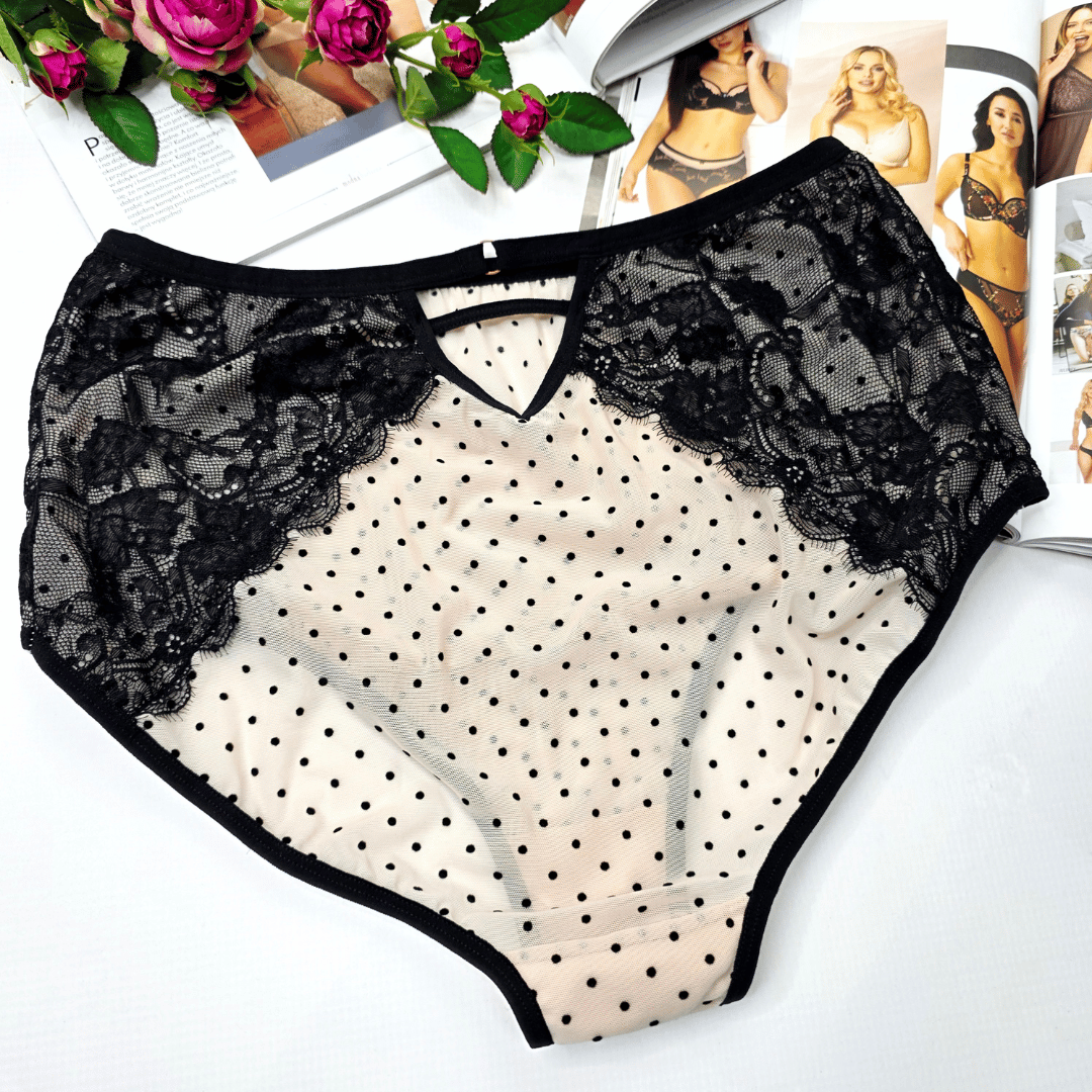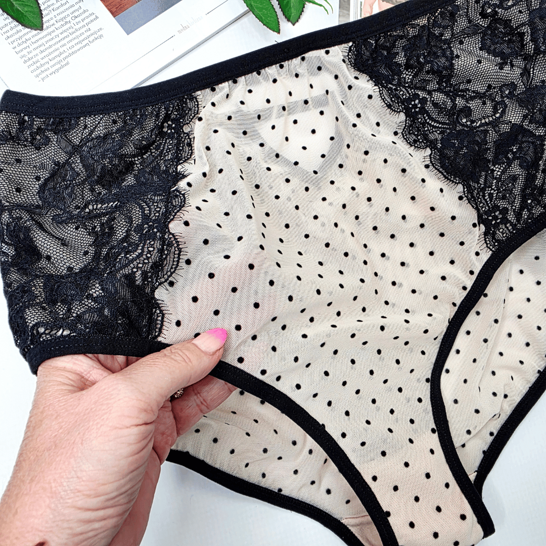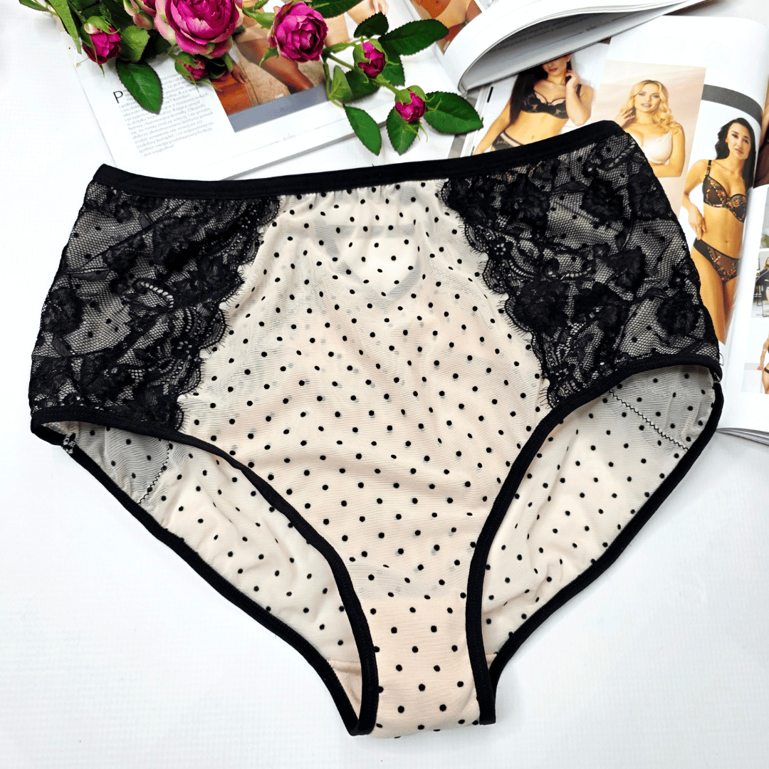 Majtki z siateczki z koronką i ozdobnymi paseczkami wysoki stan TATIANA Limited Edition cielisto/czarny
