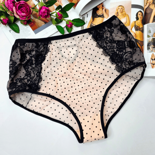 Majtki z siateczki z koronką i ozdobnymi paseczkami wysoki stan TATIANA Limited Edition pudrowo/czarny