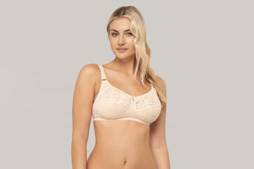 Biustonosz nieusztywniany Flowerline, wysoko zabudowany z szerokimi ramiączkami i delikatną koronką, pięknie zdobiącą dolną i górną miseczkę. Konstrukcja wzmocniona pionowym cięciem miseczek, dzięki której biustonosz doskonale podtrzymuje, dopasowuje się i nadaje szczególny kształt biustowi. Zaprojektowany z myślą o kobietach z dużym biustem, ceniących sobie komfort, wygodę oraz klasykę. Nieusztywniane miseczki z pionowym cięciem. Szerokie, regulowane ramiączka. Wspierający panel boczny w miseczkach. Tylne zapięcia wykonane na trzy haftki z dwustopniową regulacją obwodu. Bez fiszbinów. Wnętrze miseczek pokryte jest dzianiną bawełnianą. Doskonała konstrukcja. Odpowiednie dla kobiet z dużym biustem. Idealnie podkreśla, podtrzymuje i dopasowuje się do kształtu piersi. Naturalne piękno i zapewnienie komfortu noszenia i użytkowania.