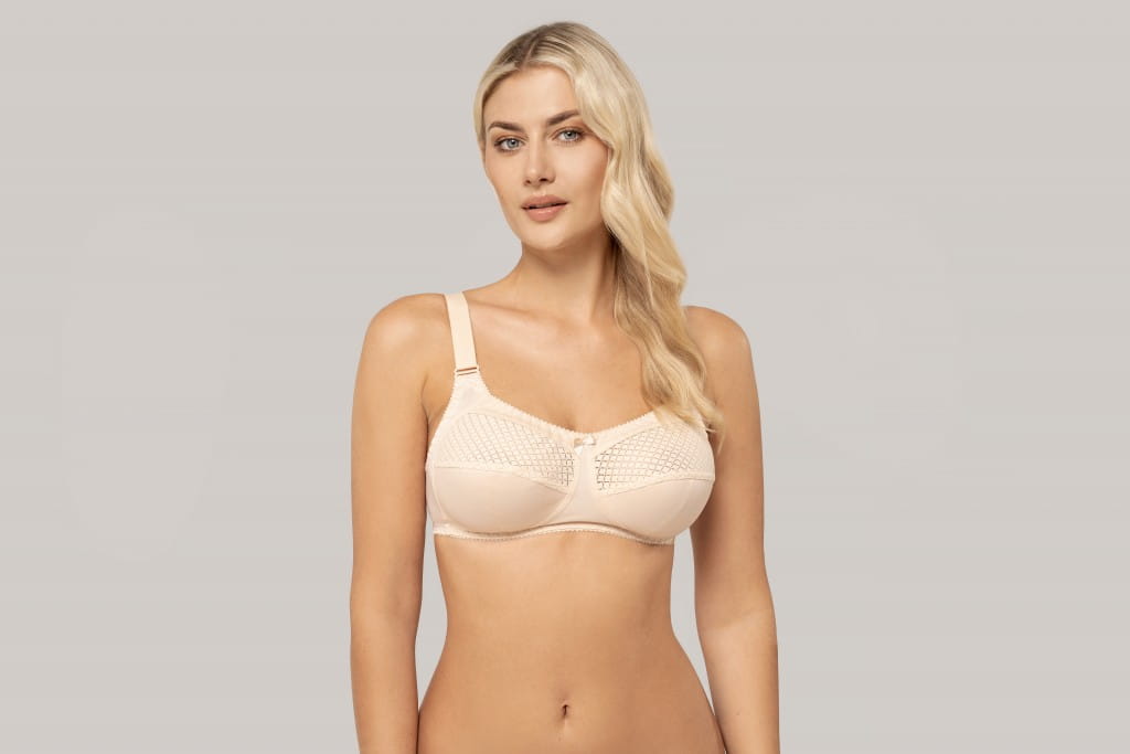 Biustonosz nieusztywniany Anvil, wysoko zabudowany, z szerokimi ramiączkami. Delikatna dzianina w połączeniu z unikatową koronką w kształcie rombów, pięknie zdobiącą górną miseczkę, nadaje szczególny kształt każdemu rodzajowi biustu. Konstrukcja wzmocniona pionowym cięciem miseczek, dzięki której biustonosz doskonale podtrzymuje, dopasowuje się i nadaje szczególny kształt biustowi. Zaprojektowany z myślą o kobietach z dużym biustem, ceniących sobie komfort, wygodę oraz klasykę. Nieusztywniane miseczki z pionowym cięciem. Szerokie, regulowane ramiączka. Wspierający panel boczny w miseczkach. Tylne zapięcia wykonane na trzy haftki z dwustopniową regulacją obwodu. Bez fiszbinów. Wnętrze miseczek pokryte jest dzianiną bawełnianą. Doskonała konstrukcja. Odpowiednie dla kobiet z dużym biustem. Idealnie podkreśla, podtrzymuje i dopasowuje się do kształtu piersi. Naturalne piękno i zapewnienie komfortu noszenia i użytkowania.