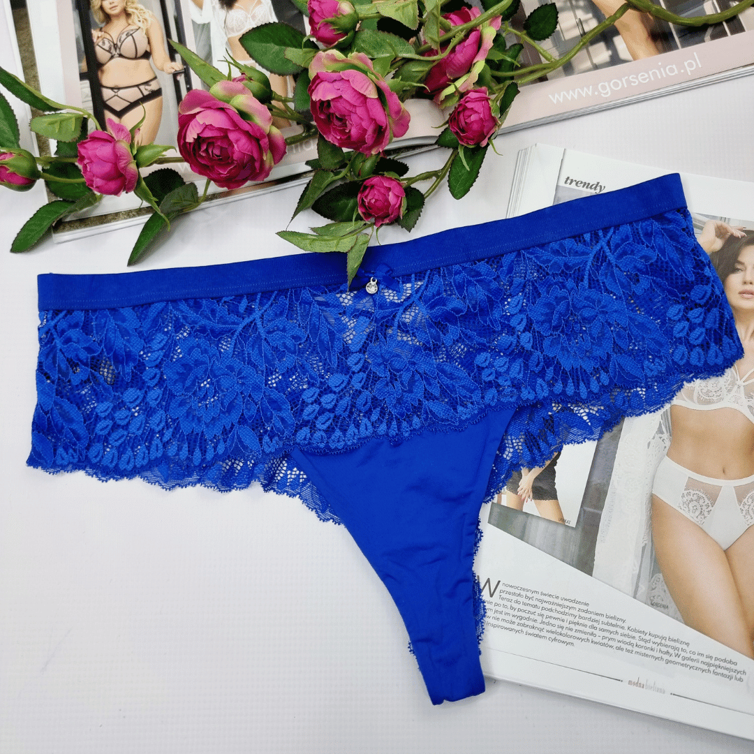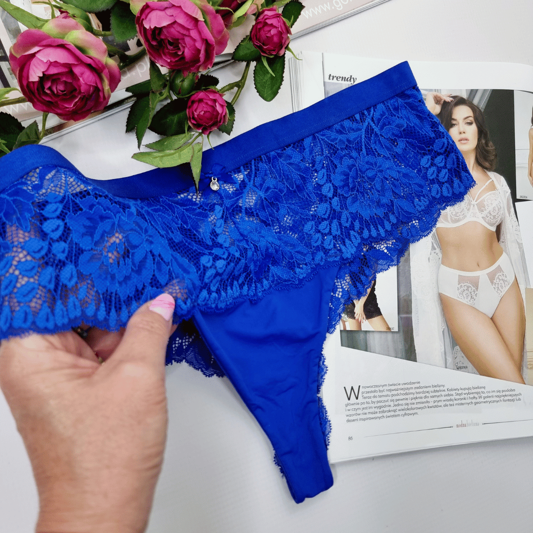 Stringi koronkowe wysoki stan z imitacją przewiązania plus size Lavita chabrowy