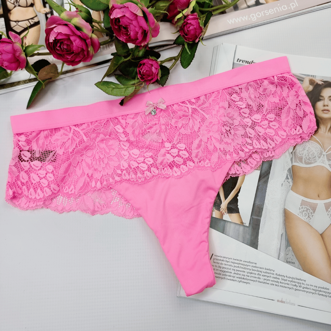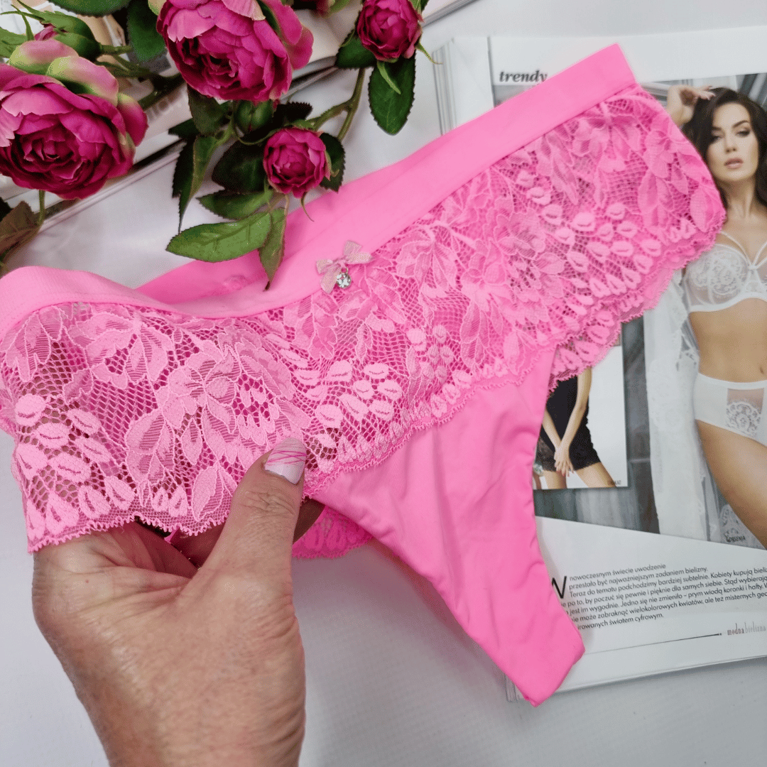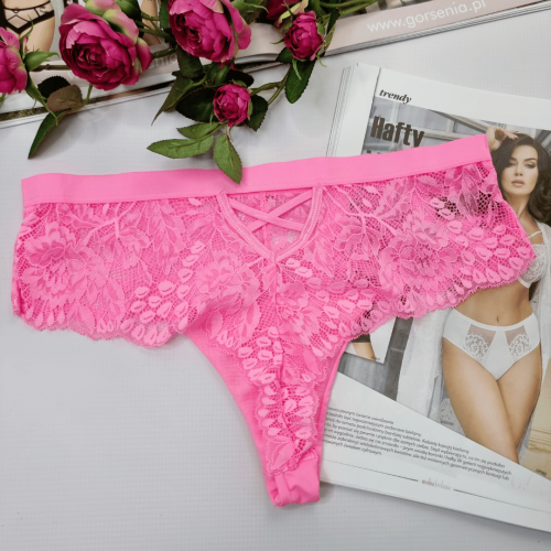 Stringi koronkowe wysoki stan z imitacją przewiązania plus size Lavita neonowy różowy